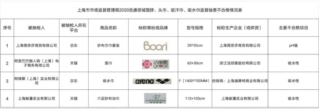 市市场监管局对天猫、京东、百联3个网络平台销售的20批次围脖、头巾、吸汗巾、吸水巾进行了监督抽查,经检测,有4批次不合格。不合格项目为ph值、吸水性。详见↓