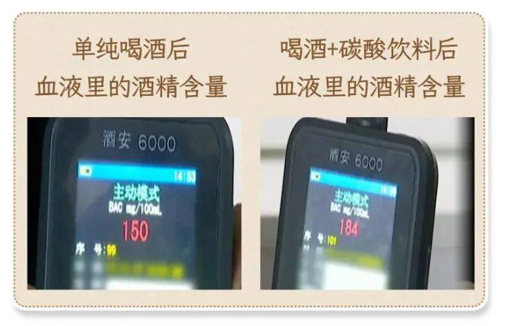 经过检测发现,只喝酒后,血液里的酒精含量150mg/ml;而酒和碳酸饮料一起喝下,血液里的酒精含量为184mg/ml。
