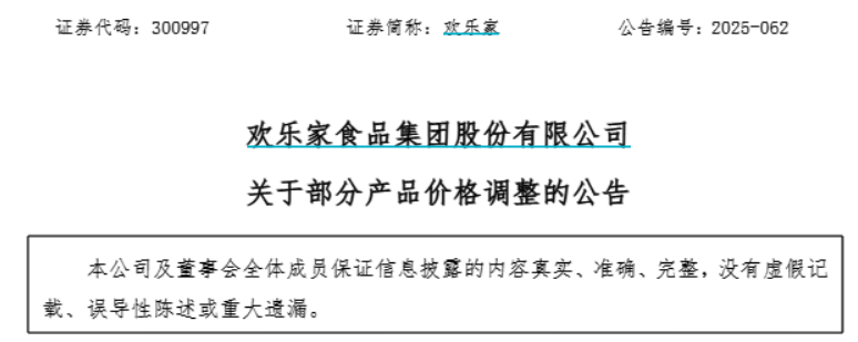 【大河财立方消息】6月23日,欢乐家食品集团股份有限公司(证券简称欢乐家)发布公告称,对部分产品价格进行调整。