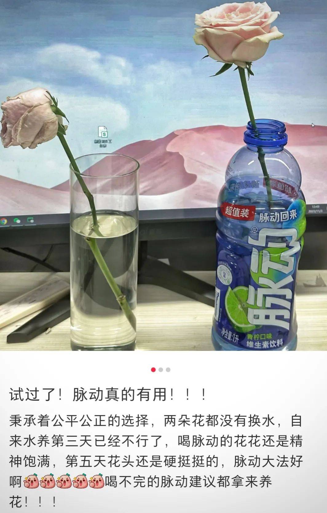 起因是有人分享自己用脉动养花的经历。家里原本萎靡不振的花,某天无意被浇了点脉动,没想到滋养下竟奇迹般地恢复生机。这一发现迅速在网友中传播开来,还因此在网上喜提一个新称号:“复活水”。