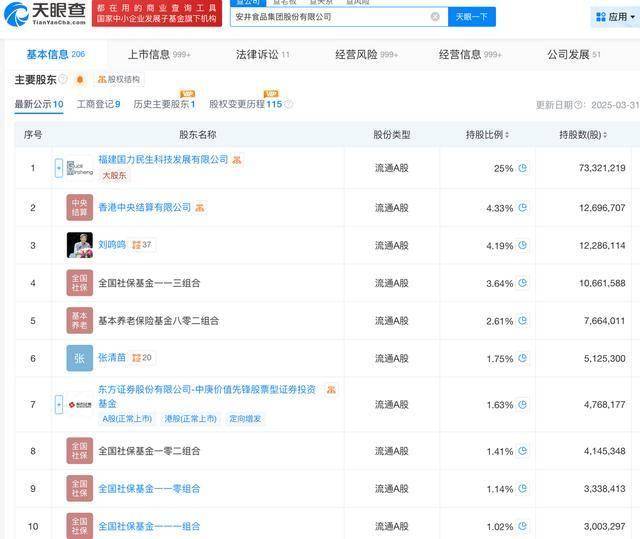 天眼查App信息显示,安井食品成立于2001年12月,位于福建省厦门市,前身为厦门华顺民生食品有限公司。目前,该公司的注册资本约2.9亿元,法定代表人为刘鸣鸣,主要股东包括福建国力民生科技发展有限公司、刘鸣鸣等。