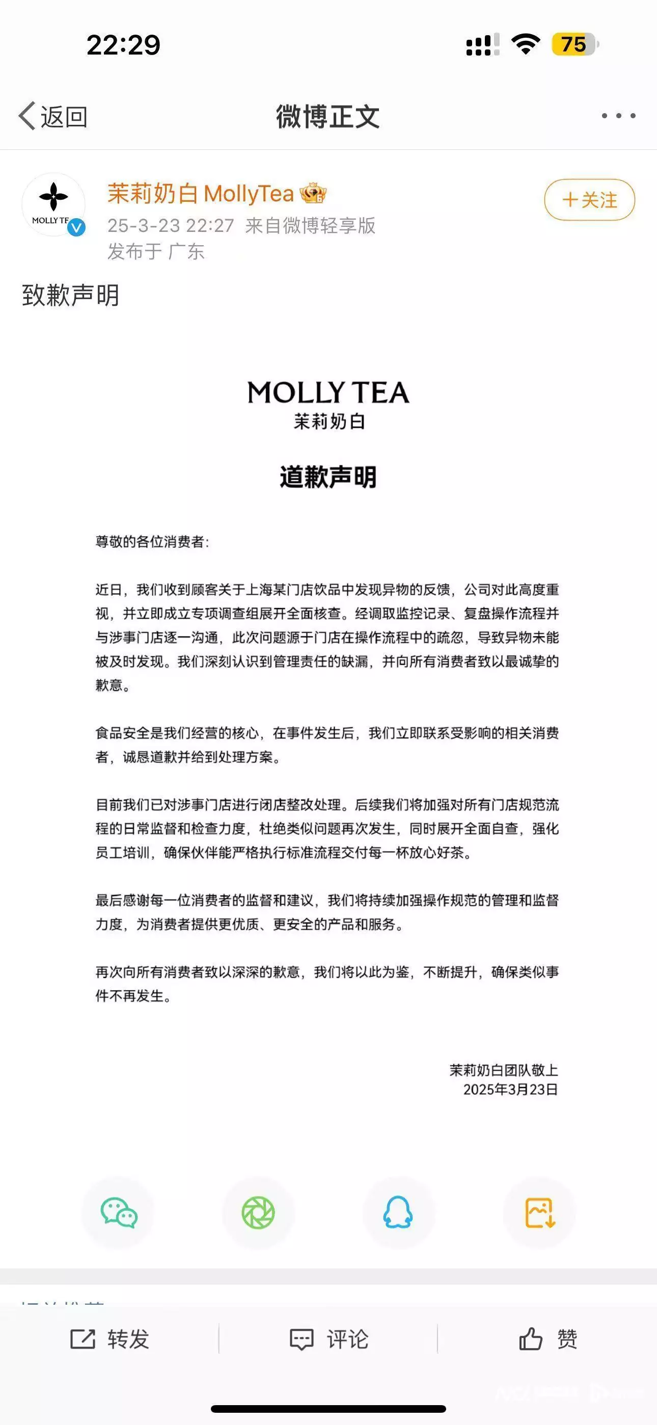 3月23日晚,茉莉奶白官方微博针对此事发布致歉声明。声明显示,近日,公司对此高度重视,并立即成立专项调查组展开全面核查。经调取监控记录、复盘操作流程并与涉事门店逐一沟通,此次问题源于门店在操作流程中的疏忽,导致异物未能被及时发现,“我们深刻认识到管理责任的缺漏,并向所有消费者致以最诚挚的歉意”。