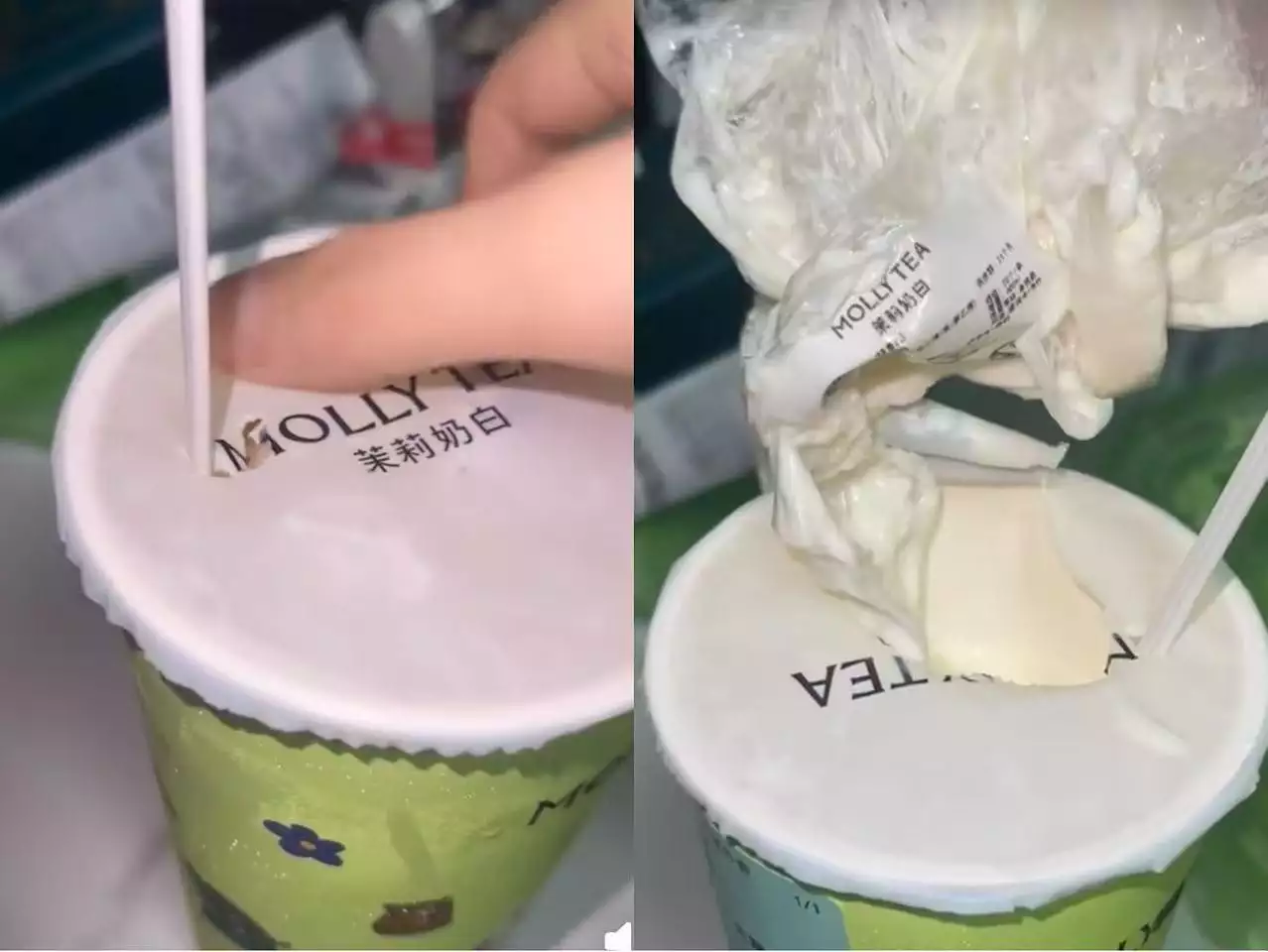 消费者在社交平台称,她插吸管时感觉奶茶中有东西挡着,撕开一看发现有塑料袋。其发布的视频显示,该消费者撕开奶茶纸盖,从里面抽出了一个完整的塑料袋,塑料袋上还贴有写着“茉莉奶白”的标签。