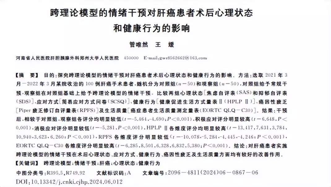 [1]管唯然,王媛,跨理论模型的情绪干预对肝癌患者术后心理状态 和健康行为的影响,中国健康心理学杂志,2024-04-08