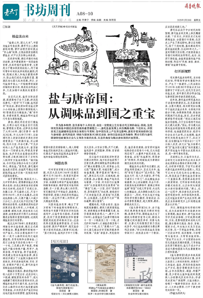 有关唐代盐史的研究,自20世纪初始,即得到学者的重视和关注,产生了一批著作。人民出版社于1997年出版的《中国盐业史》全面撰写了中国古代、近代乃至当代的盐业史,其中唐代部分即由《盐与唐帝国》的作者吴丽娱完成。
