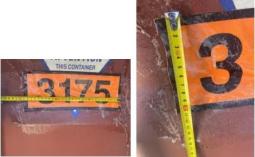 装有联合国编号为UN 3175危险货物的集装箱,其标记尺寸经测量宽为290 mm,高为110 mm。违反了IMDG规则第5.3.2.1.2中货物运输组件联合国编号标记高不小于120 mm,宽不小于300 mm的要求。