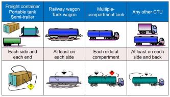 对于集装箱、半挂车、封闭式或软开顶散货箱或可移动罐柜,在组件每侧和每端各一个;容积不超过3000 L的可移动罐柜可仅在其相对的两侧使用标牌,也可使用标志代替;对于铁路罐车,至少在每侧粘贴;对于盛装一种以上危险货物或其残留物的多格罐柜,在相关分格间的位置,沿每侧标记,如果每个分格间要求显示的标牌相同,这些标牌仅需沿着货物运输组件每侧显示一次;对于柔性散货箱,至少在对立的两面;对于其他任何货物运输组件,至少在组件背面和两侧粘贴。
