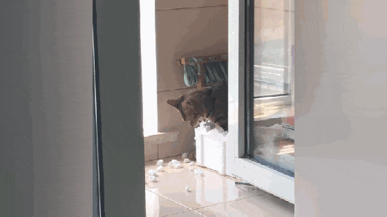 塑料袋小小的封闭的空间,有时候也会像纸盒一样,吸引猫咪钻进钻出。