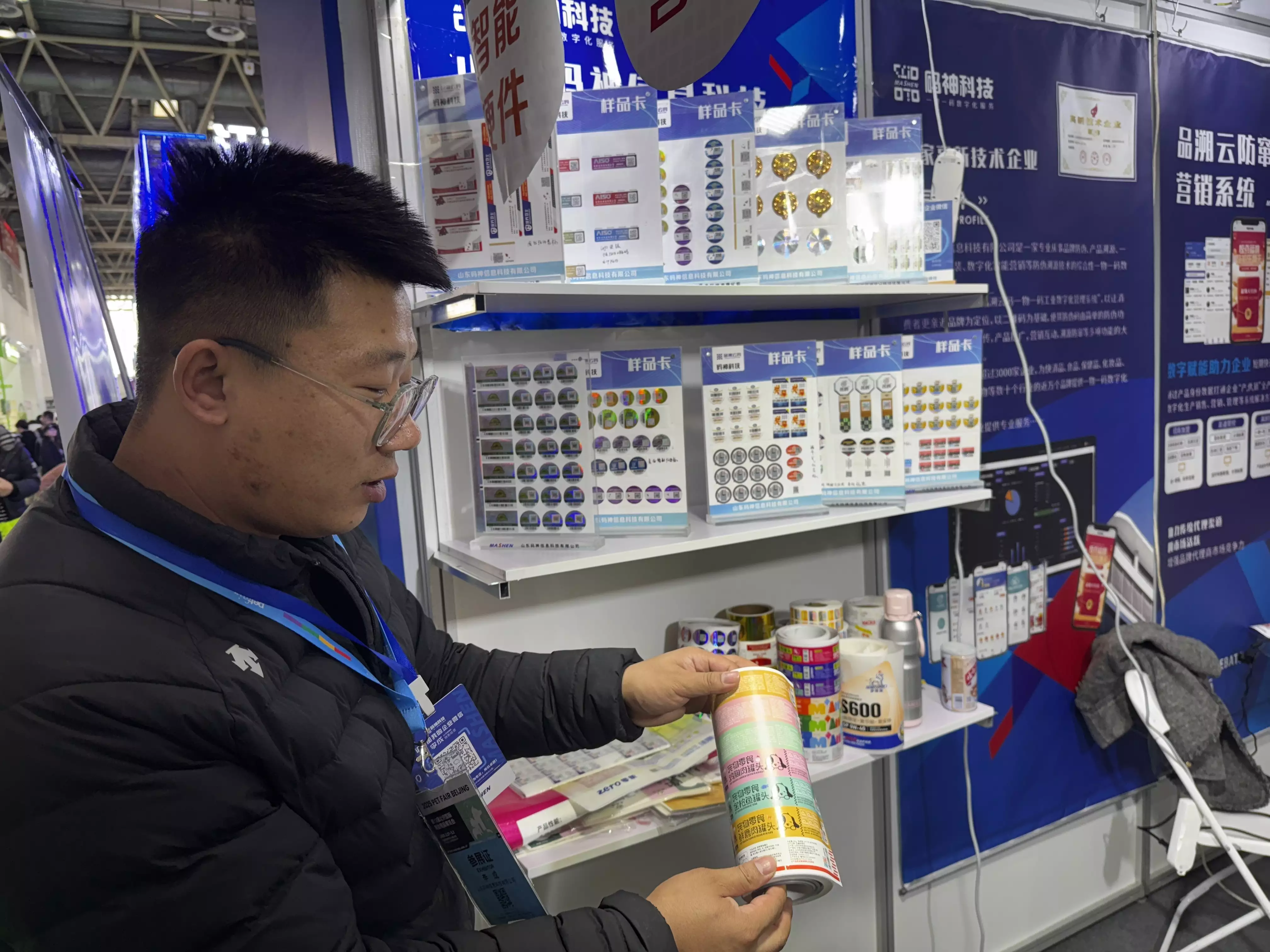2月27日,第12届北京国际宠物用品展开幕当日,山东某信息科技公司参展人员介绍防伪溯源标签样品。新华社记者 王奕涵 摄