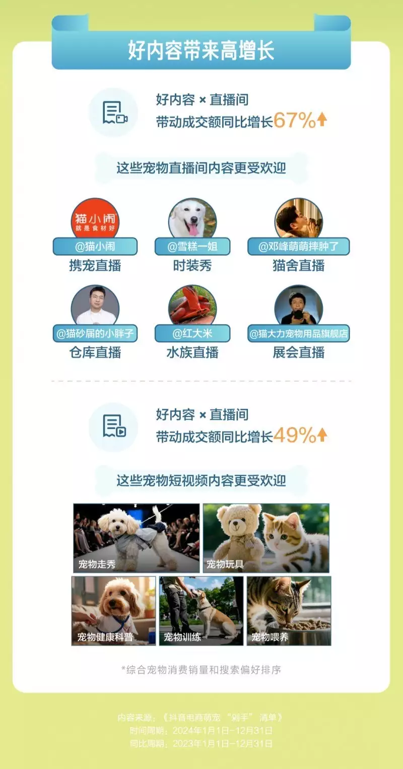 好内容已经成为宠物消费增长的重要驱动力。从可爱的宠物日常,到专业的养宠知识科普,各类萌宠内容不断涌现,充分满足了用户对宠物的好奇与喜爱。携宠直播、猫舍直播、宠物走秀、健康科普等直播间和短视频好内容,深受用户喜爱,带动成交额同比分别增长67%和49%。