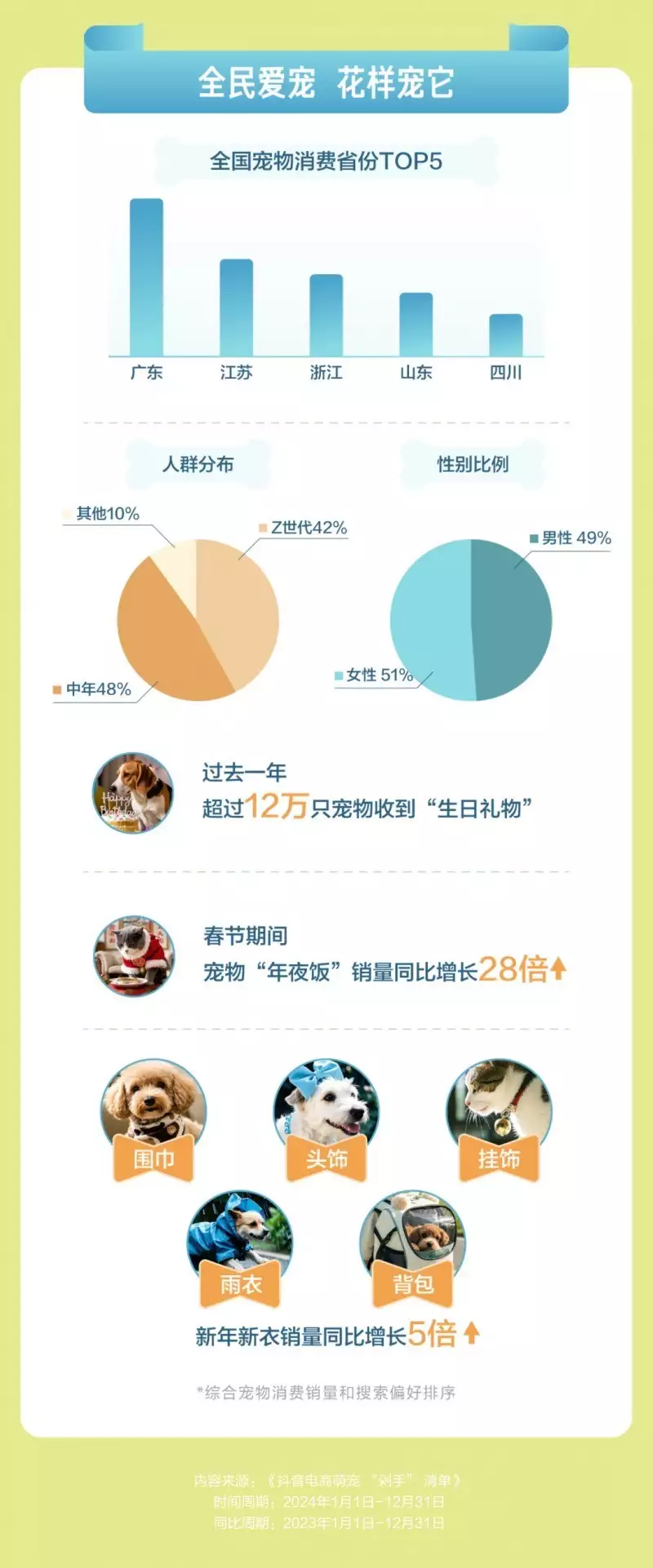 在宠物消费人群中,广东人位居消费榜首位。Z世代和中年人群是养宠和消费的主力军,Z世代凭借其独特的消费观念以及对宠物的钟爱,在宠物消费中展现出强大的购买力;相对而言,中年群体经济实力较雄厚,也更加注重宠物的生活品质,愿意为宠物投入更多。人们对宠物的关爱不仅体现在日常生活里,更体现在特殊的日子里。过去一年,超过12万只宠物收到“生日礼物”;春节期间,宠物“年夜饭”销量同比增长28倍,新年新衣销量同比增长5倍。