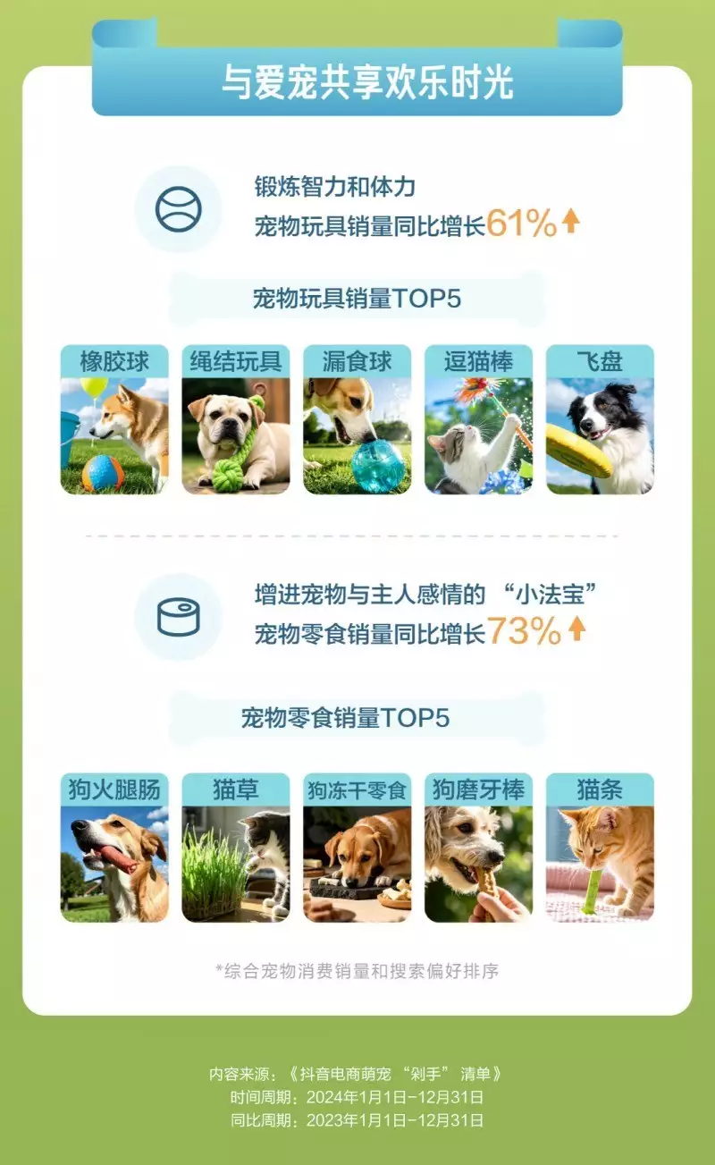 能锻炼宠物智力与体力的宠物玩具销量亦有显著提升,同比增长达 61%。橡胶球、绳结玩具、漏食球、逗猫棒、飞盘玩具位列销量TOP5。宠物零食凭借丰富的种类和诱人的口感,受到狗狗和猫咪们的喜爱,销量同比增长73%。猫草、狗冻干零食、狗磨牙棒、猫条等成为热门选择,也成为增进宠物与主人感情的“小法宝”。