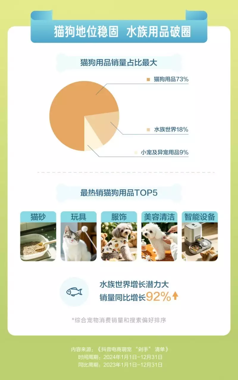 宠物用品在满足宠物基本生活需求之外,也反映出宠物消费的新趋势。数据表明,猫狗用品的销量仍占据主导,占比达73%。这其中智能设备十分热销,成为铲屎官的新宠。除猫狗用品外,新兴宠物相关用品在抖音电商宠物消费领域中异军突起,展现出巨大的增长潜力。其中,水族世界相关用品销量同比增长92%,成为宠物用品中的一匹黑马。