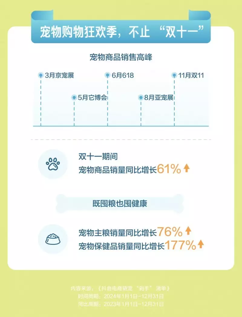 宠物商品的销售呈现出显著的“节点效应”,3月的京宠展、5月的它博会、6月的“618”、8月的亚宠展以及11月的“双十一”皆为销售旺季。京宠展和它博会等专业展会,不单是宠物行业的盛会,也是宠物商品销售的重要平台。去年“双十一”期间,抖音电商宠物商品销量同比增长 61% 。宠物主们在这些购物节大量囤货,来满足宠物未来一段时间的生活需求。除“囤粮”外,宠物主们愈发注重宠物的健康,为宠物购置各类保健品,如维生素、益生菌、关节护理产品等,以提高宠物的免疫力和生活质量。数据显示,猫狗保健品销量同比增长了177%。