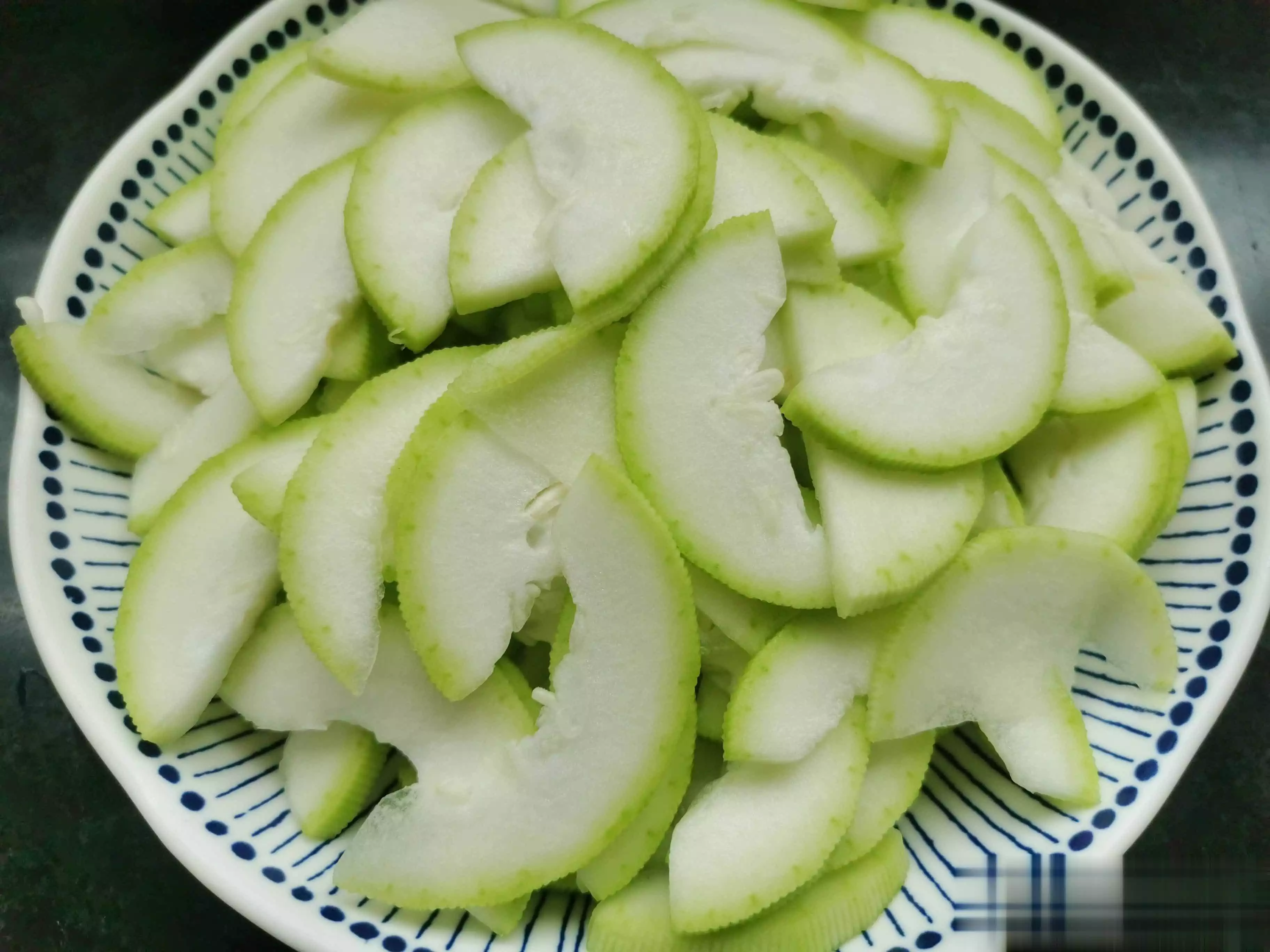 1、瓠子去皮,一切两半,中间有种子的话去掉瓜瓤,切成薄片。