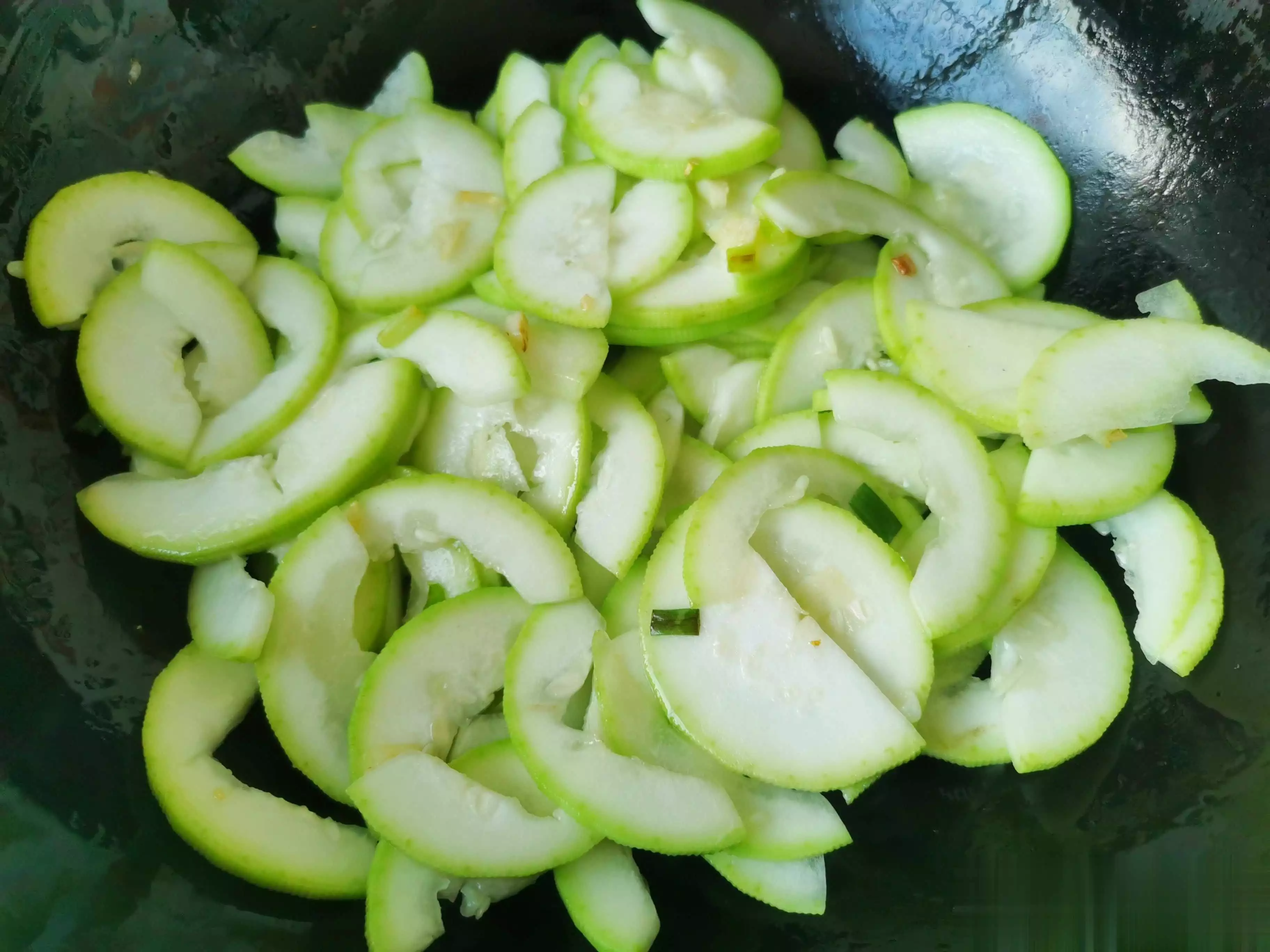 2、锅中倒入食用油,油热倒入葱花、蒜末炒出香味,倒入瓠子翻炒至微软。