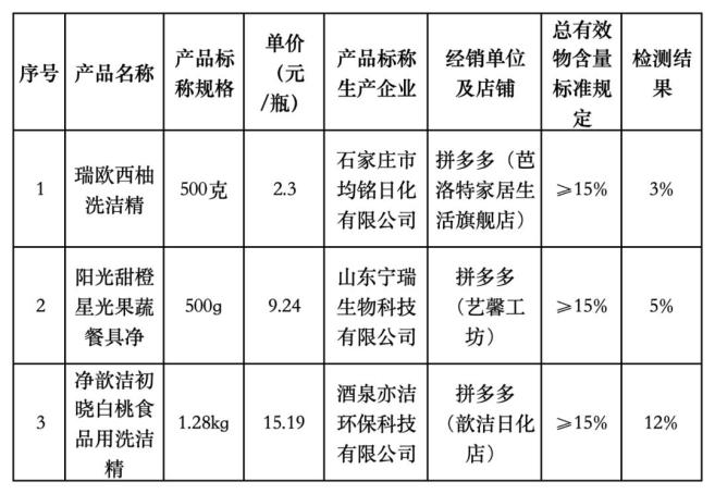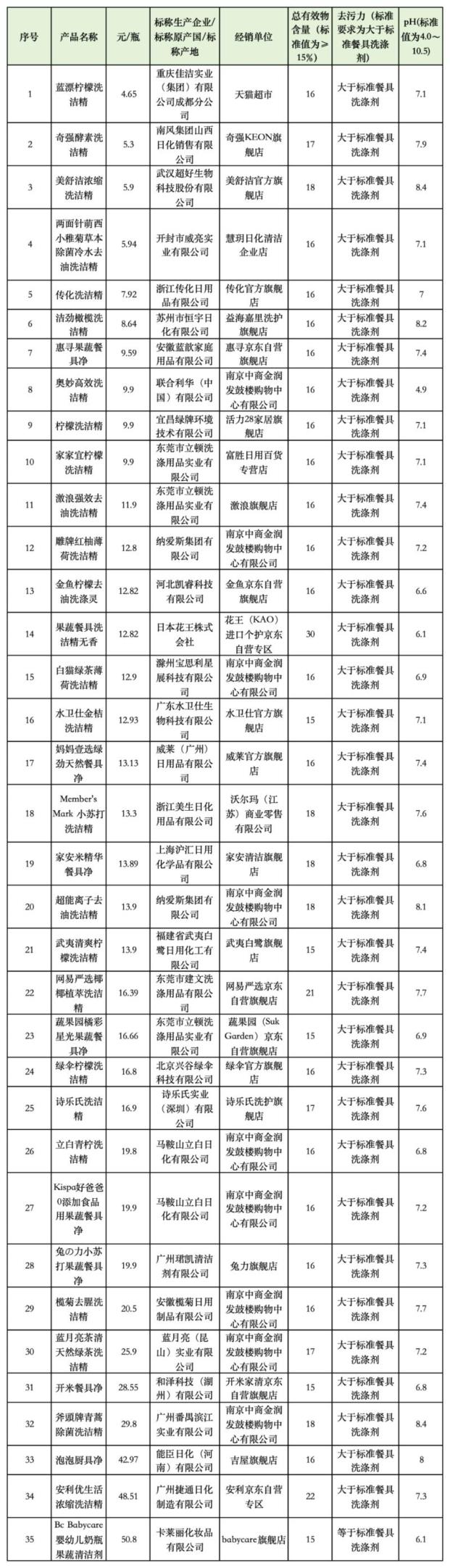 此外,标称产品名称为“Frosch柠檬浓缩餐具洗洁液”为进口产品,无明示标准,检测结果为10%,不做判定;“康威龙健康洗洁精”执行的是企业标准,企标要求总活性物≥10%,检测结果为14%,未判定不符合标准。