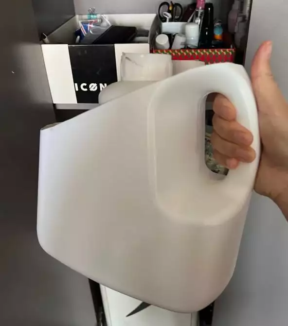 将洗衣液桶上部斜切45度角,切口要打磨圆滑,避免划伤。