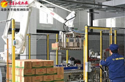 2月25日,在新疆七一酱园生态酿造有限公司包装车间,机械手臂自动叠放商品,工人准备装车,即将运往疆内外市场。记者陈岩摄2月25日,走进七一酱园酿造公司的产业园区,视线开阔,几栋楼体崭新,这是企业的第四代厂区,去年下半年投用,今年正式全面生产。