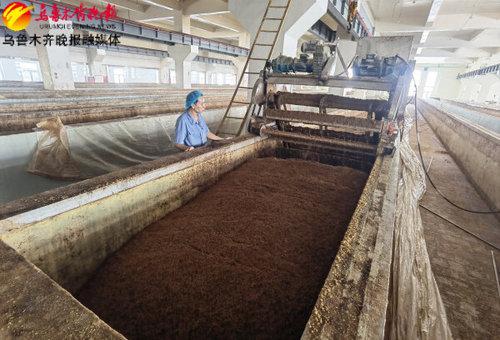 2月25日,在新疆七一酱园生态酿造有限公司包装车间,一袋袋食醋下线、包装装车,即将运往疆内外市场。记者陈岩摄原料投产,首先是经过煮料等过程,才能到发酵环节。在发酵的1个月时间内,每3天需要捯池1次,以保障氧气的充足、发酵彻底。发酵后再到沉醅环节,沉醅5个月后,达到理化指标才能进入淋醋、压榨等工艺后,进入成品醋、酱油罐沉淀待包装。