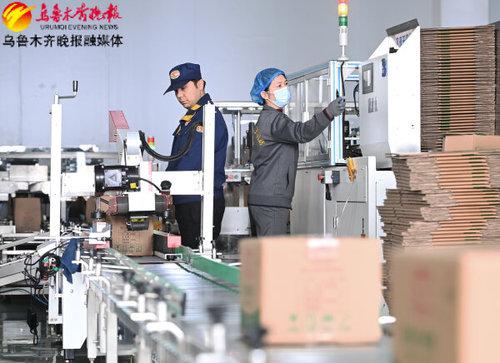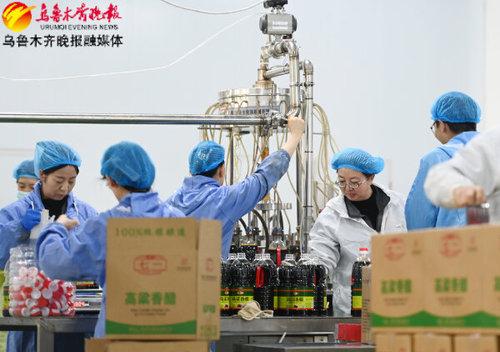 2月25日,在新疆七一酱园生态酿造有限公司包装车间,一袋袋食醋下线、包装装车,即将运往疆内外市场。记者陈岩摄七一酱园酿造公司生产部生产总监杨斌说,目前,企业正在生产南北疆经销商订购的产品,袋装车间日产能2600件,与老厂区的日产能1300件相比,翻了一番。袋装包装车间有2条生产线,同时生产时,日产能超过5000件。