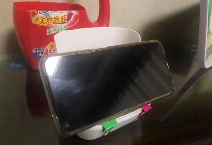 把小号的洗衣液瓶剪一下,然后夹上面两个燕尾夹,就可以当做手机支架了,
