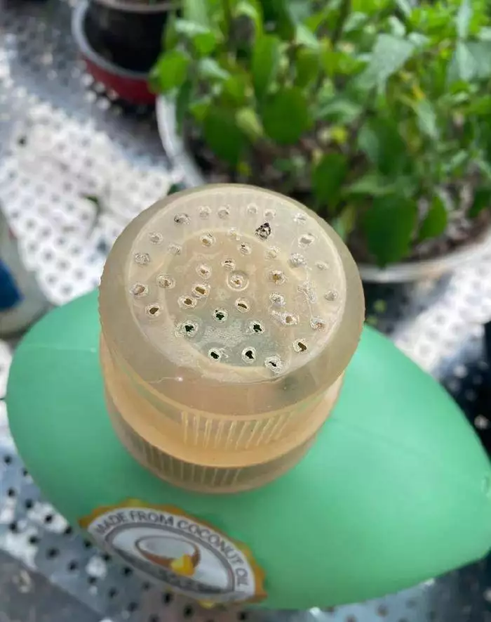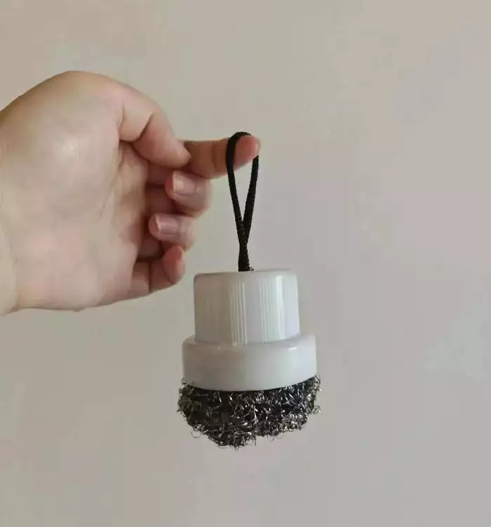 使用钢丝球的时候是不是直接用手?时间长了手上都毛刺了,可以将洗衣液瓶盖收纳钢丝球,把洗衣液的盖子戳一个洞,然后将皮筋栓在钢丝球上面在穿过盖子就行了,以后用钢丝球都不用直接用手了。