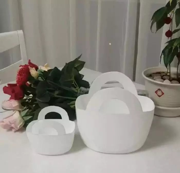 白色的洗衣液空瓶,刷洗干净之后就用铅笔画出一个小把手的形状,然后就按照这个形状剪下来,这就是一个手提篮,放在桌面可以收纳小物件,颜值还很高。