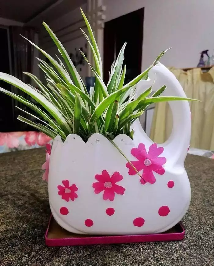 而且还自带一个把手,很方便尤其是放上五颜六色的鲜花,就更加美丽了,放在家里桌面上还真看不出来竟然是一个洗衣液的瓶子。