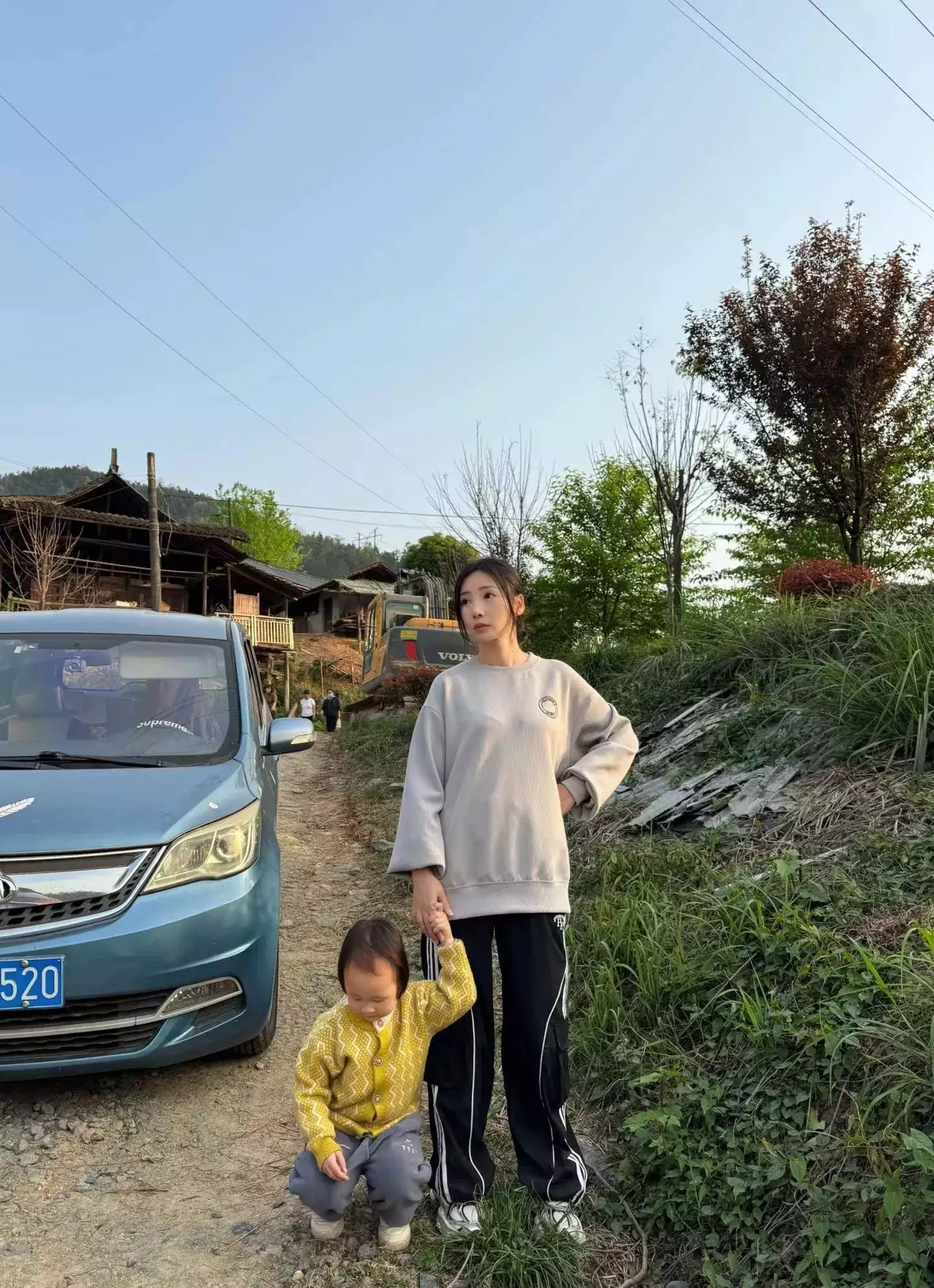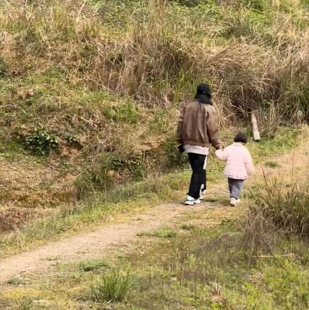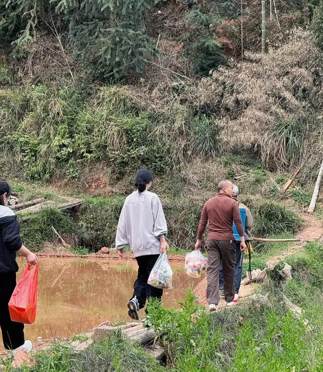 照片里她身穿一件宽松卫衣,头发随意扎起,手提皱巴巴的塑料袋,深一脚浅一脚踩着雨后泥泞的田坎。