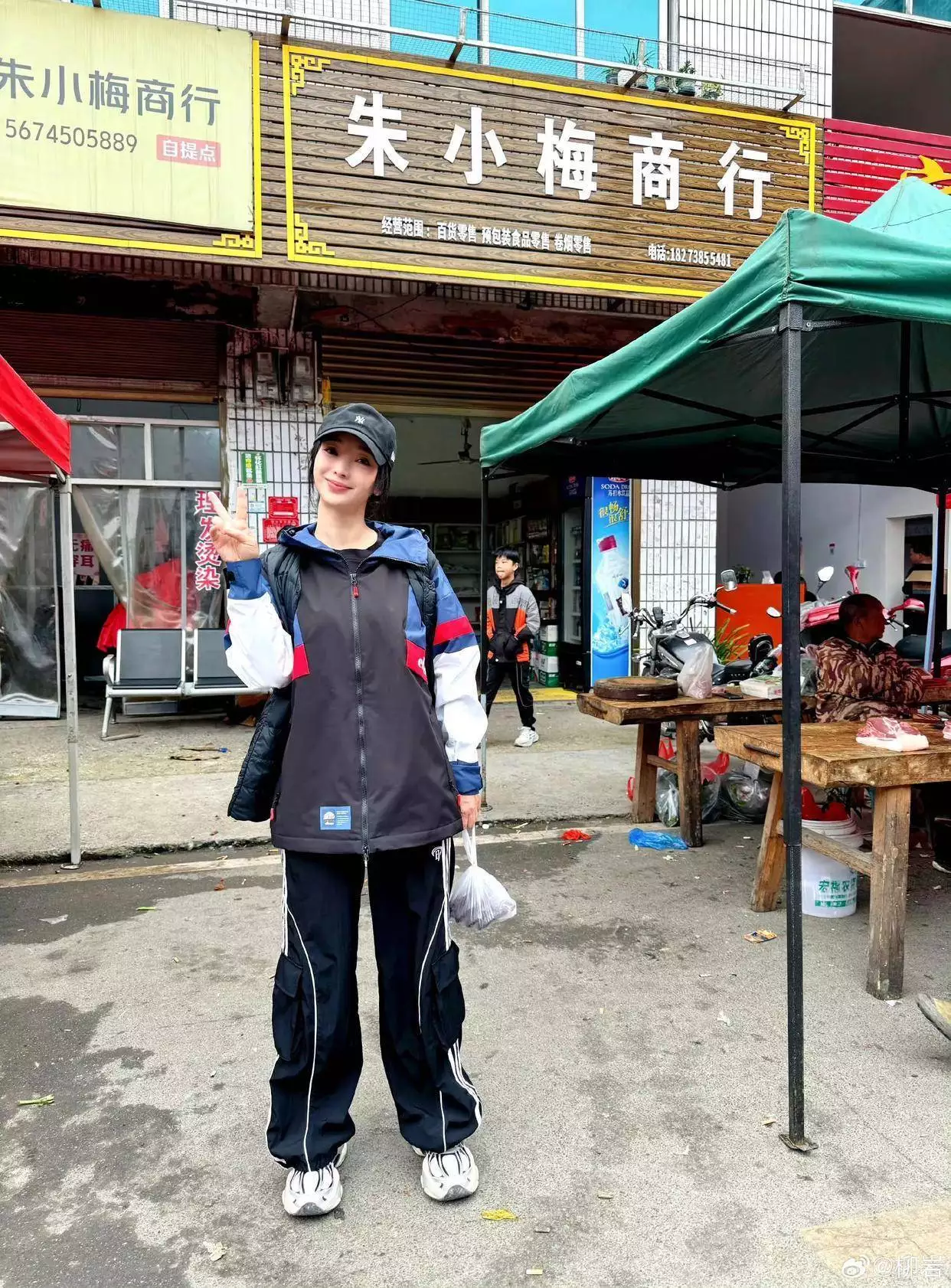 前面老乡背着嗡嗡作响的除草机,身后是青瓦斑驳的老屋,这画面哪像明星?活脱脱是个返乡赶集的湘妹子!