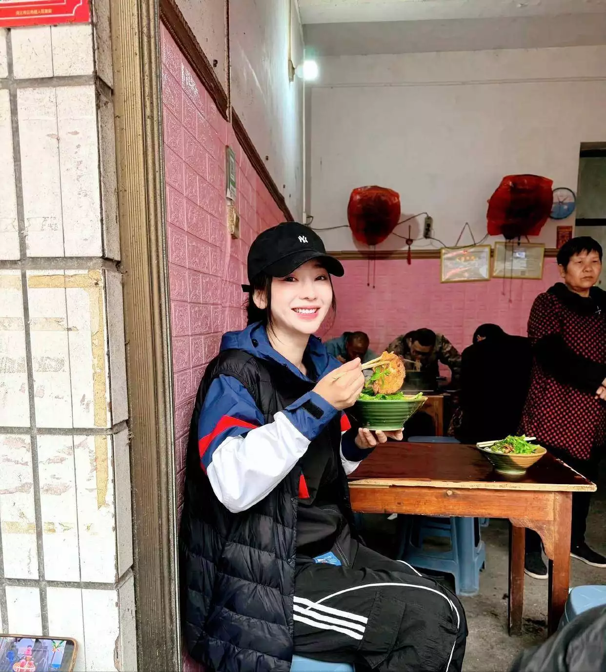 在村头小馆嗦粉时,品尝着家乡的味道,露出幸福的笑容,油点子溅到袖口她也浑然不知;