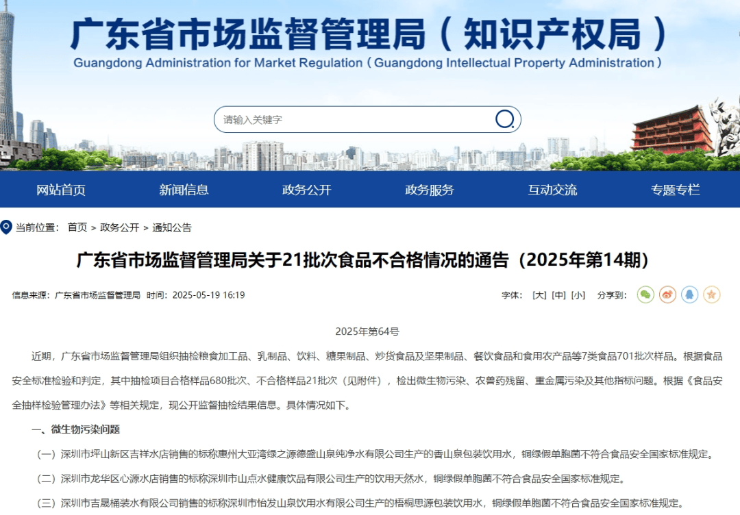 5月19日,广东省市场监督管理局官网通告了该局关于21批次食品不合格情况。其中,抽检的包装饮用水不合格样品3批次, 不合格项为铜绿假单胞菌超标。