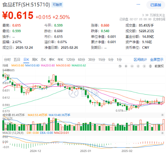 场内热门ETF方面,反映吃喝板块整体走势的食品ETF(515710)开盘拉升后全天几乎单边上扬,最终场内价格收涨2.5%,日线两连阳。