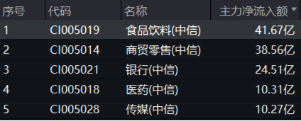 资金面上,吃喝板块今日获主力资金大举涌入。Wind数据显示,截至收盘,食品饮料板块单日获主力资金净流入额达到41.67亿元,净流入额在30个中信一级行业中高居首位。