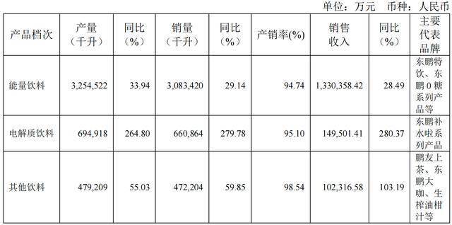 东鹏饮料生产并对外销售的主要产品类别包括:能量饮料、电解质饮料、咖啡(类)饮料、茶(类)饮料、预调制酒饮料以及果蔬汁类饮料等。业绩数据显示,来自能量饮料的收入占比降至84%,首次不足九成,但仍然是公司收入的绝对主力军。