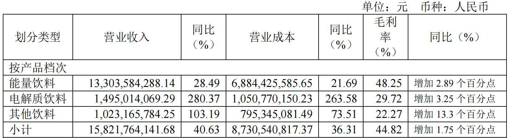 2024年,东鹏饮料的能量饮料卖了133亿元,同比增长28.49%。更为夸张的是,东鹏饮料把能量饮料毛利率做到48.25%,同比增加2.89个百分点。