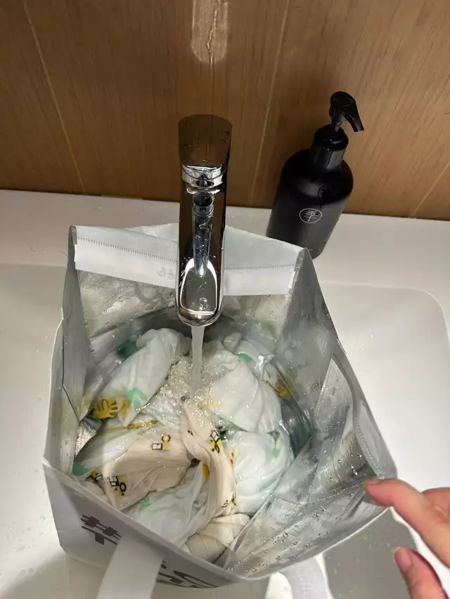 不如给自己点个外卖吧,或者是直接在家带一个外卖保温袋,把水接到袋子里,就秒变洗衣盆了。