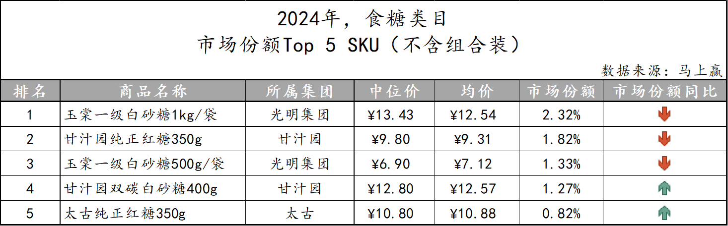 基于SKU销售额在类目销售额中的份额来看类目中的Top SKU,有两款为光明集团产品,两款为甘汁园集团产品,余下的一款属于太古。其中,从口味上看,红糖、白糖各有侧重,两糖种占据了Top 5 SKU。