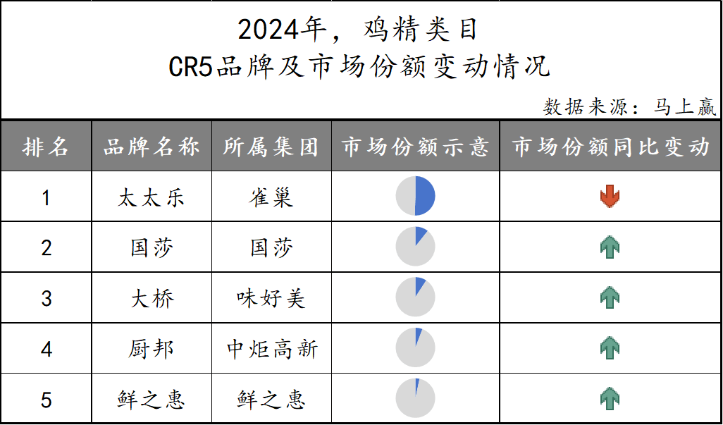 太太乐在鸡精市场中可谓是一家独大,所占市场份额在50%左右。国莎、大桥、厨邦以及鲜之惠与之同为CR5品牌之列,份额明显更低的同时,均有一定程度的同比增长。