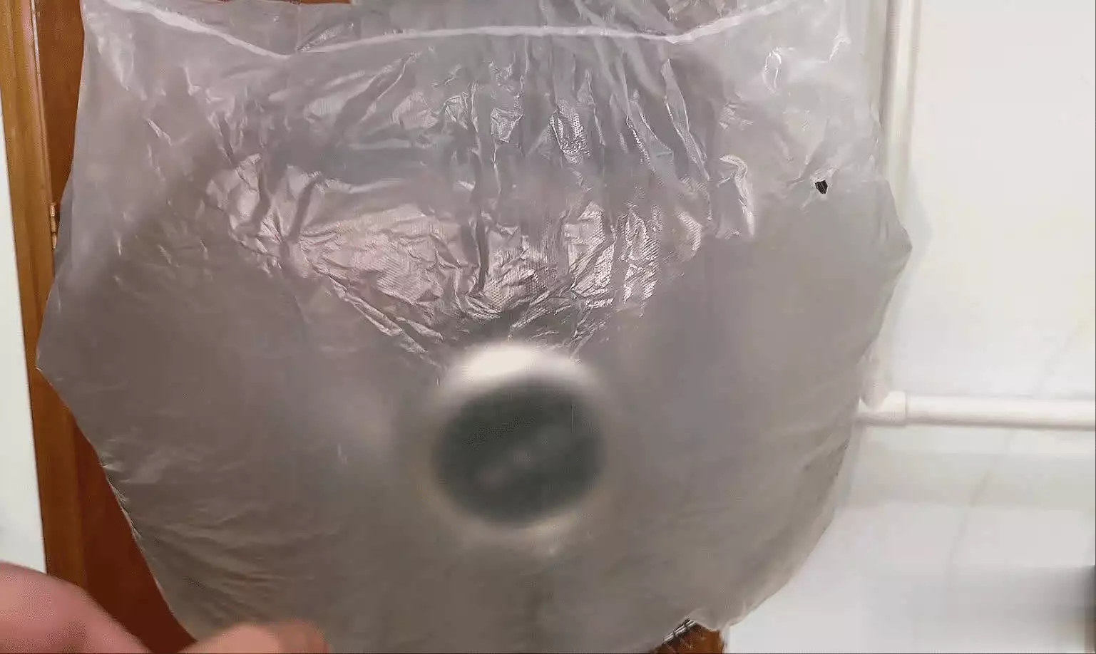 大家会看到电风扇在吹风时,塑料袋鼓鼓的。因为风吹不出来,会在塑料袋内循环吹,这样就可以利用电风扇自身风力,把扇叶表面污渍,彻底冲洗干净。