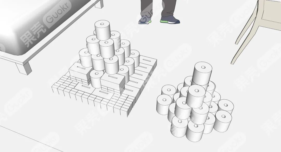 几摞纸巾放地上占地约0.32平方米,什么概念呢?如果有人来家里做客,凳子不够的时候,光是1箱卷纸就可以当个临时小板凳了。