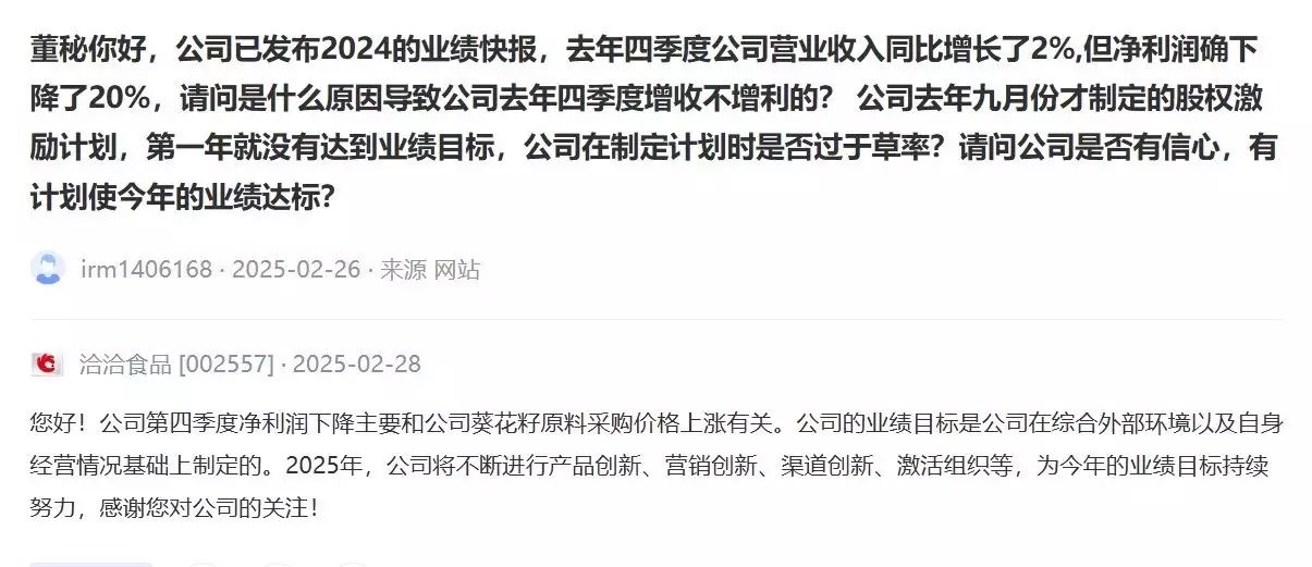 激励计划首年“折戟”同样引发投资者广泛关注,洽洽食品表示,公司股票期权激励计划中2024年度业绩考核目标的实际完成情况以公司审计后的数据为准。2025年,公司将不断进行产品创新、营销创新、渠道创新、激活组织等,为今年的业绩目标持续努力。