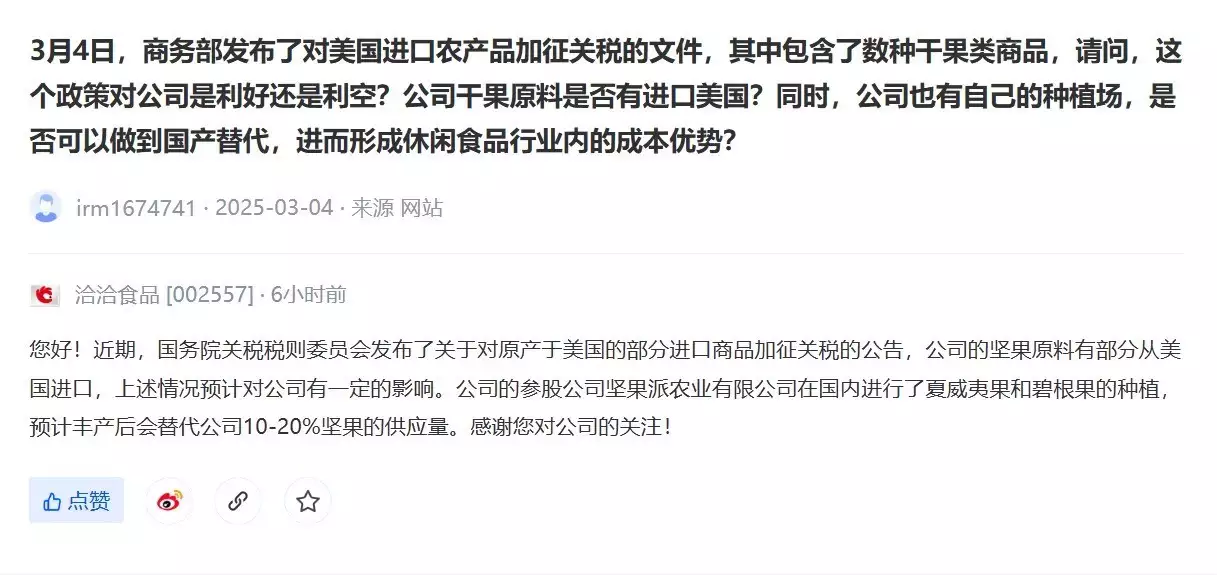 3月8日,深交所互动平台上,“瓜子大王”洽洽食品(002557)就投资者关切问题作出回应。近期,国务院关税税则委员会发布了关于对原产于美国的部分进口商品加征关税的公告,公司的坚果原料有部分从美国进口,上述情况预计对公司有一定的影响。
