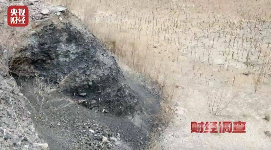 随后,记者跟随村民来到这个煤矸石填埋场附近的水沟,眼下正是枯水期,水沟已干涸断流,但这道黑色淤泥疤痕,依然清晰可见。这条黑色的水沟从煤矸石填埋场流出,直通村里的水道。而这个村庄距离黄河一级支流——汾河仅有300米的距离。