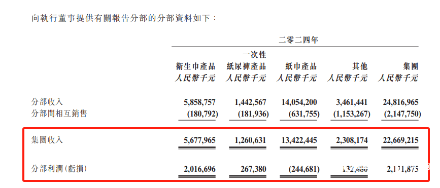 财报显示,2024年,纸巾产品收入同比下滑2.37%至134.22亿元,营收占比59.2%,分部利润亏损2.45亿元,对比来看,该板块2023年盈利2.44亿元。该板块毛利率由2023年的21.7%下跌至18.9%。
