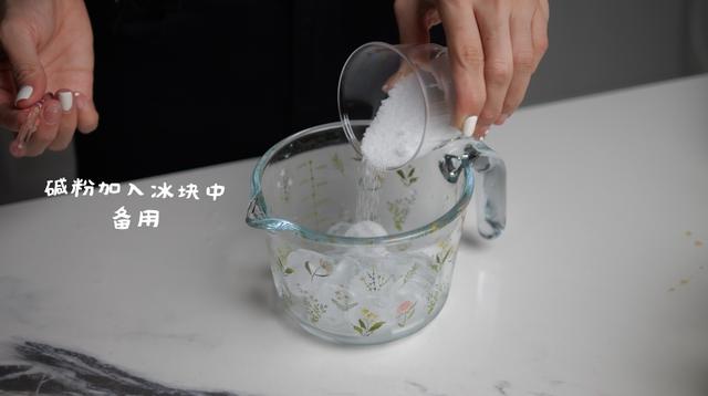 1.在冰块中少量多次加入碱,融化后备用。