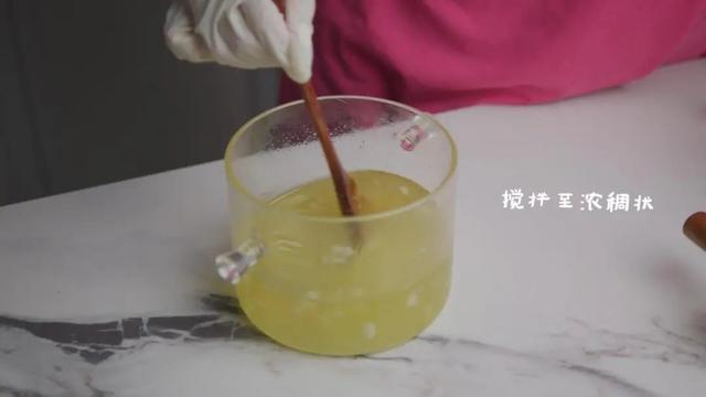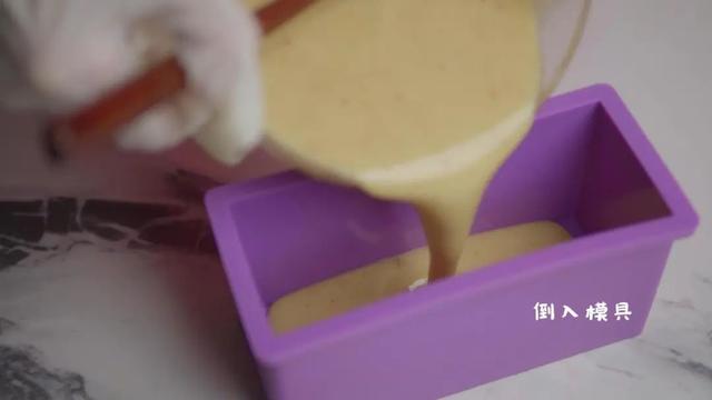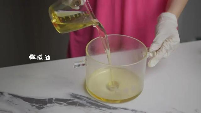 2.容器内倒入橄榄油、榛果油、椰子油、棕榈油、融化后的乳木果油、融化后的碱液,搅拌至浓稠状。