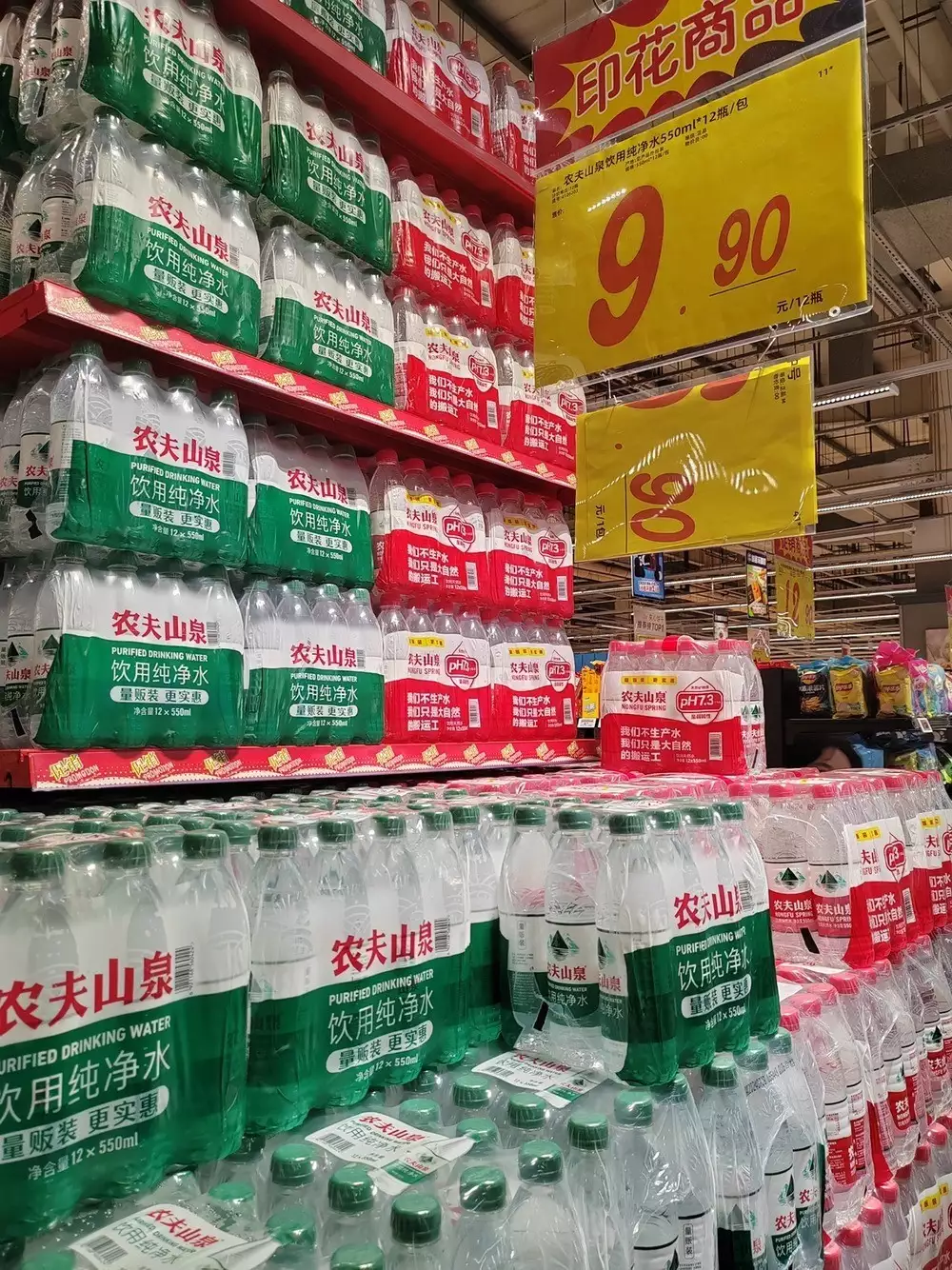 记者则在深圳一家华润超市走访时发现,农夫山泉红瓶和红瓶装一打550ml装的售价为12.8元,而绿瓶装纯净水同样规格的价格也为12.8元,但会员价更是低至9.9元。相比之下,怡宝是12.9元会员价是11.9元,一打装景田是15.5元,会员价是11.9元。