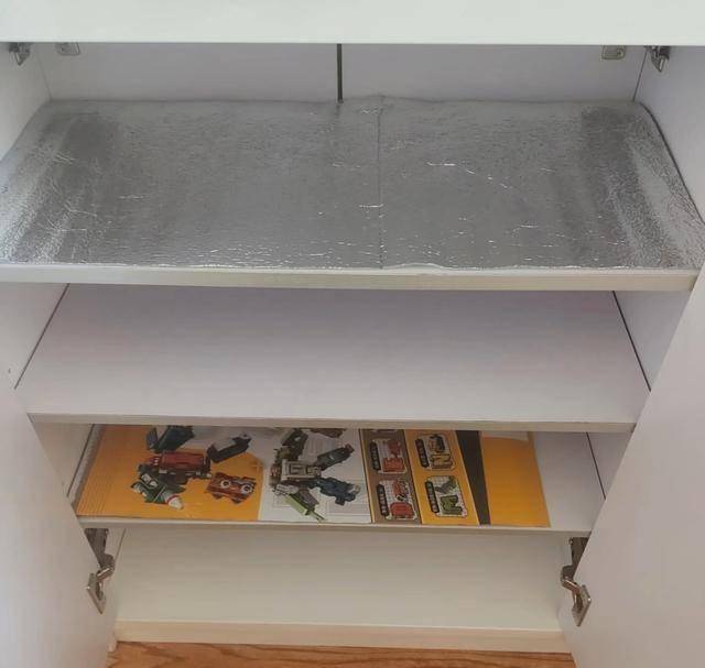 鞋柜里直接放鞋的话,很容易把隔板弄脏,过一阵就得擦一擦,麻烦,直接给层板上铺一层保温袋,这不就起到隔脏作用了吗?